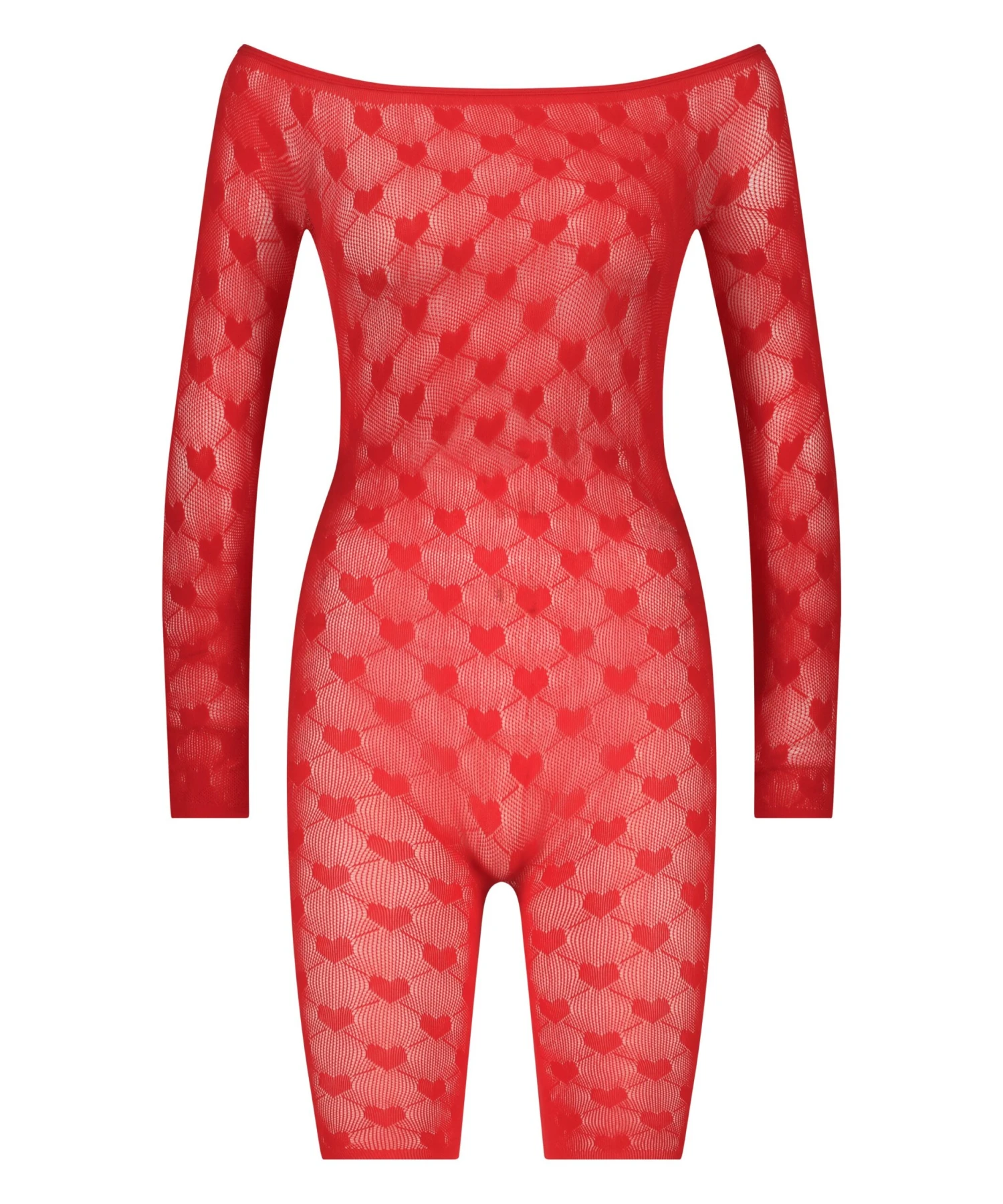 Fühe dich romantisch in diesem süßen Herz-Playsuit! Durchgehender halbtransparenter Look mit Herz-Stickereien überall. Super bequem mit langen Ärmeln und Shorts. Bestandteil der Private Collection